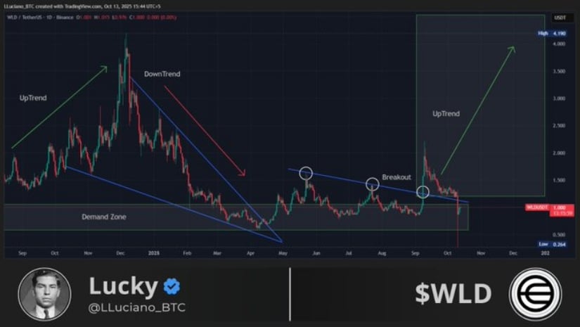 分析师Lucky在最新推文中强调$WLD正在形成的结构,指出该代币过去一年始终在明确的上升趋势与下降趋势间震荡。