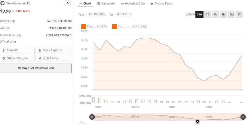 BraveNewCoin数据显示,Worldcoin现报0.98美元,24小时跌幅2.10%,市值21.5亿美元,24小时交易量3.229亿美元。