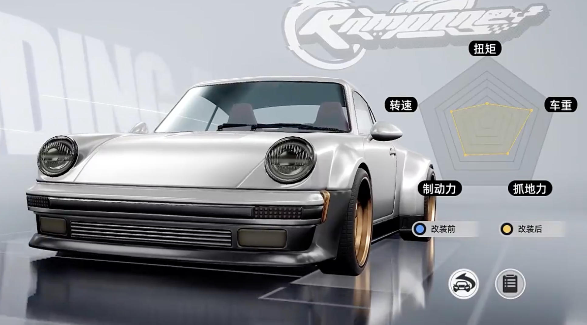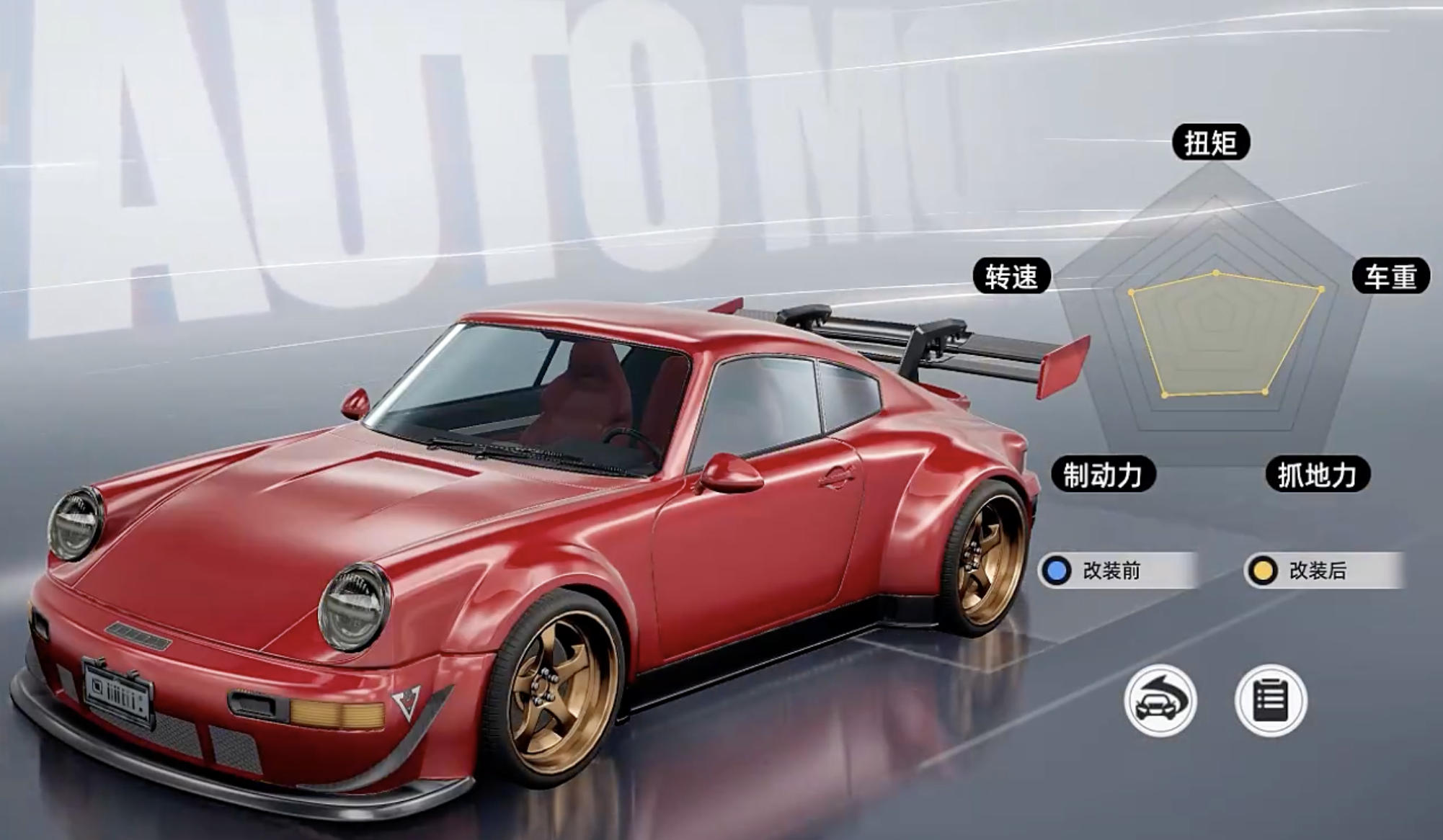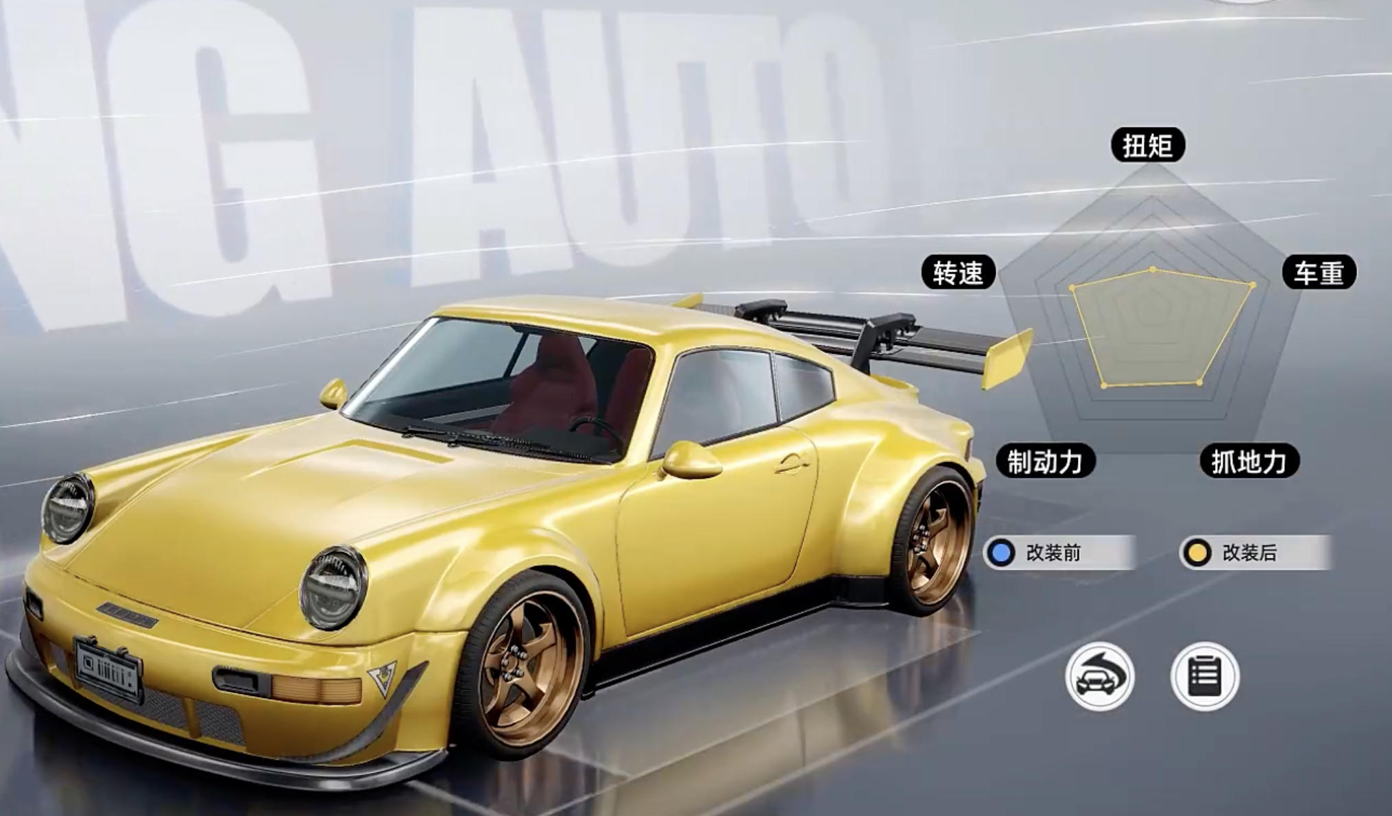 真正决定比赛胜负的是性能调校部分。车辆的抓地力、制动力、转速、扭矩以及车重这五项核心参数,直接影响操控稳定性和加速能力。高抓地力有助于平稳过弯,强制动系统可缩短刹车距离,转速和扭矩共同决定起步与冲刺效率,而车重则影响整体驾驶手感——过重导致迟钝,过轻容易漂移失控。每项改装组件都会对这五个维度产生具体变化,玩家可通过五维图清晰对比各项属性差异。
