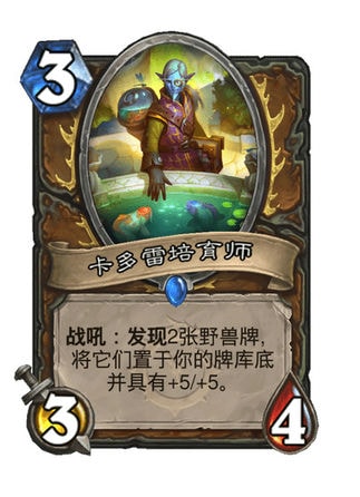 战吼:发现2张野兽牌,将它们置于你的牌库底并具有+5/+5。