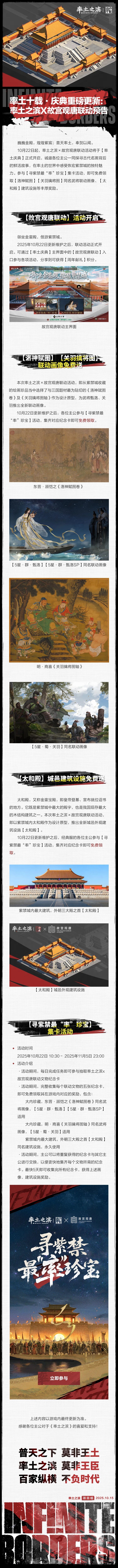 10月22日起,率土之滨×故宫观唐联动活动将于【率土庆典】正式开启,诚邀各位主公一同探寻古代名画背后的鲜活故事,在率土的世界中感受恢宏紫禁城的独特魅力。参与【寻紫禁最“率”珍宝】集卡活动,即可免费领取【洛神赋图】【关羽擒将图】同名武将联动画像、【太和殿】建筑设施等丰厚奖励。