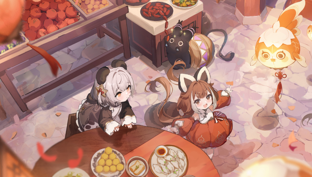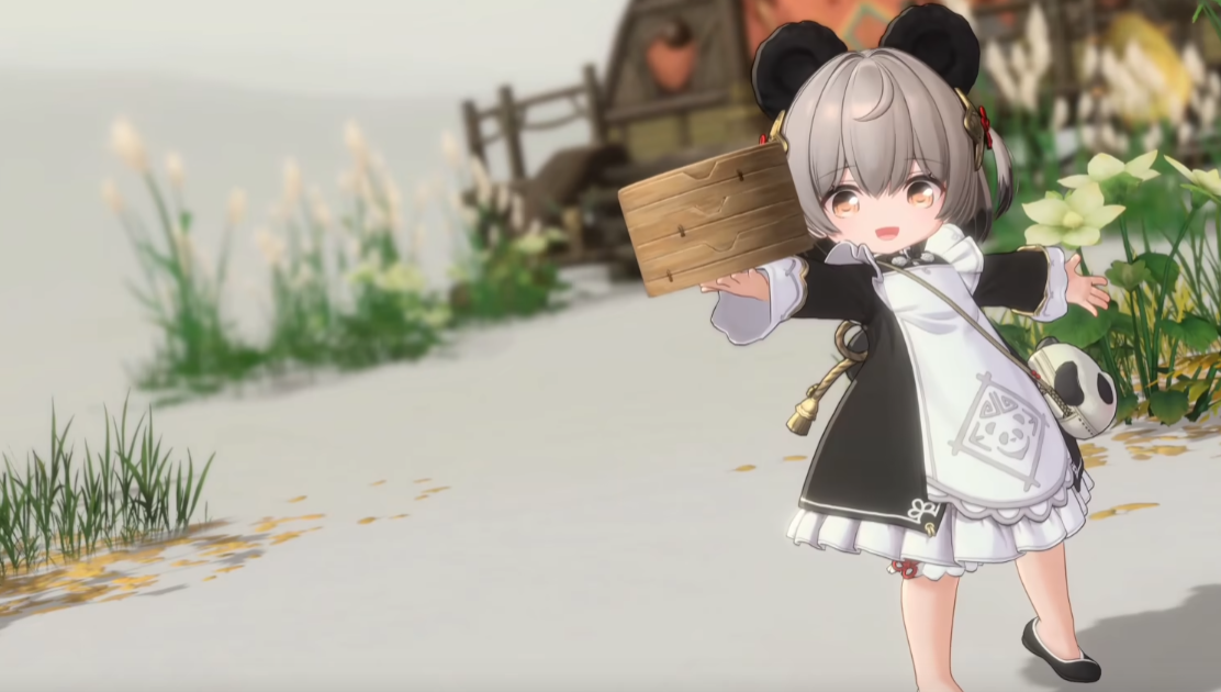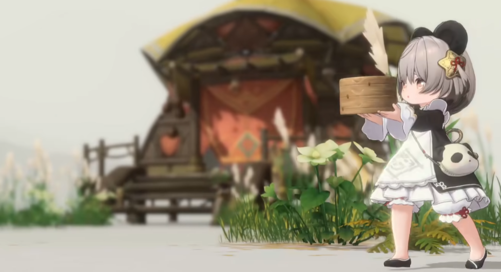 她的外观设计融合了鲜明的东方元素:标志性的黑白熊猫耳朵搭配灰色短发,身穿具有中式风格的黑白服饰,衣摆处饰有细腻的传统纹样,并配有小巧的铃铛装饰。腰间悬挂着一个熊猫造型的小包,整体造型既复古又富有生活气息。她常抱着蒸笼,姿态活泼俏皮,展现出十足的活力与热情。