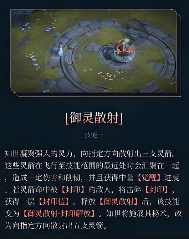 向指定方向释放三支灵力箭矢,飞行至最远端后汇聚一点,造成范围伤害与削韧,并增加中等量级的觉醒进度。若目标处于封印状态,命中后将击碎封印并额外添加封印值。释放完成后自动衔接秘术,朝同一方向射出五支灵箭,进一步提升输出频率。
