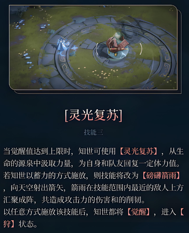 当觉醒值充满时,可施放“灵光复苏”,为自身及周围队友回复一定生命值;若采用蓄力方式释放,则变更为“磅礴雷雨”,箭矢升空后在最近敌人的位置形成雷阵,总计造成攻击力X的伤害与X点削韧值。无论哪种释放形式,都会强制触发觉醒状态,进入“狩”模式。