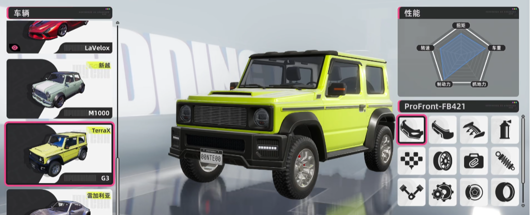 竞速车辆仅在限时赛事活动中开放获取,配备专属涂装及强化配件效果,视觉表现极具冲击力,尤其在夜间行驶时伴随动态流光特效,观赏性极强,通常用于野外高速路段体验极致速度感;至于展示型用车,则仅出现在商城界面中。