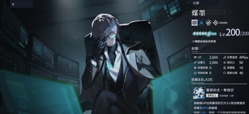 第三位登场的是煤墨,同样是名为幻影的角色。他在团队中的定位偏向支援型前锋,主要通过护盾技能为生命值最低的队友提供保护,从而增强全队的续航能力。除了护盾之外,该技能还会附带减速效果,有效干扰敌方进攻节奏。他的另一个技能为单体输出类型,当造成一定量伤害后,还可削弱目标的攻击力。更重要的是,此技能释放期间,全体队友都将获得护盾庇护。凭借高额的护盾数值和群体防护能力,煤墨能在保障后排安全的同时,显著提升整个阵容的抗压性。