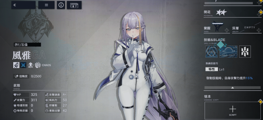 最后介绍的是风雅,一位攻防兼备的反击型前锋。她在受到敌人攻击时可触发多段反击伤害,这种物理性质的反伤不仅能削减对手攻势,还能间接提高全队的整体输出。其主动技能可在大范围内发动连续打击,配合反击机制形成持续压制力。风雅的优势在于既能承受前线压力,又能通过反制手段消耗敌方行动资源。尽管初始星级不高,但随着后期培养程度提升,她在前排的耐久度和战术价值将愈发明显。