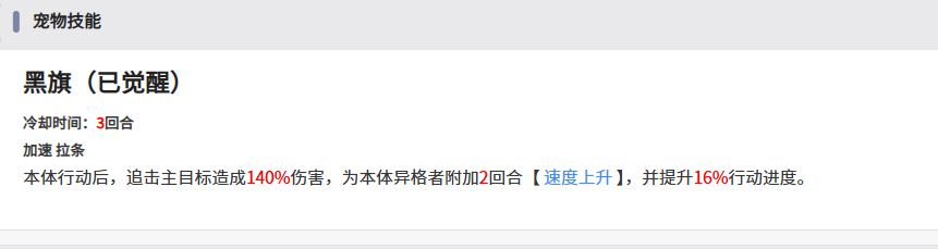 除了基础属性外,黑旗的核心亮点在于其追击机制。每当角色完成一次行动后,黑旗将触发一次额外攻击,目标锁定敌方主要单位,造成的伤害最高可达140%。这一追加输出不仅提升了整体伤害频率,也增强了对关键目标的压制力。同时,该智壳还具备增益能力,在特定条件下可为使用者提升速度属性。