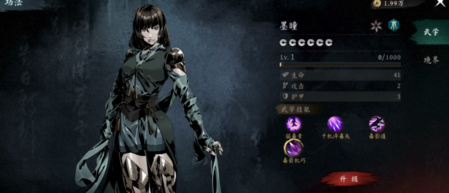 墨瞳是一位专注于毒系流派的核心输出角色,拥有强大的持续伤害能力和爆发潜力。她在技能机制上具备毒素叠加与引爆的设计,当毒素达到一定层数后可触发额外50%的伤害增幅。其技能“千机淬毒石”需消耗30点内力,释放后可射出9支远程毒箭,每支造成40%的水属性伤害并附带中毒状态,适合用来打持久消耗战。
