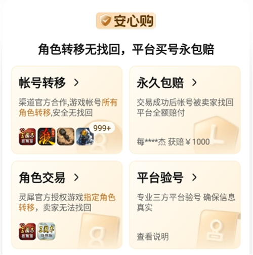 比较突出的表现还是平台提供的安心购功能,其中支持永久包赔的承诺,针对开通该保障的游戏号,交易环节彼此是需要去签署账号转让协议以及人脸识别认证的,旨在让该保障举措能去顺利的进行,当我们的订单完成交易,若是出现找回等问题,那么大家就能进入订单中心界面,去通过售后维权,到时客服就会介入其中来帮助我们核实,若是存在找回等问题,那么客服就会在规定时间内为大家去进行赔付,确保玩家自身的利益不会受到侵害。