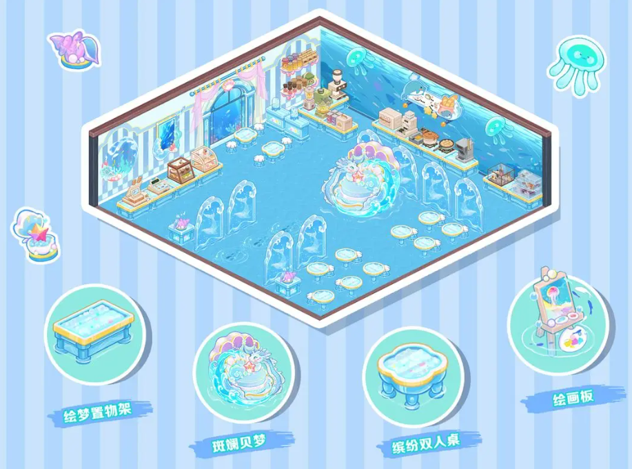 除了外观出众之外,这套家具还具备实用性强的属性加成。装备整套后可为店铺提供高达2363点环境值,这一数值直接影响店铺的整体评分和顾客吸引力。更高的环境值不仅能提升客流,还能解锁更多高级功能,例如开放稀有食材的采购权限。此外,该套装拥有专属增益效果:所有店员的厨艺值都会得到提升,从而间接提高料理制作效率与品质。