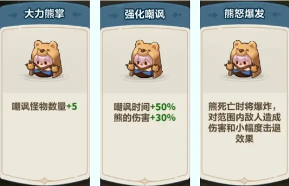 选择【大力熊掌】后,召唤熊嘲讽怪物数量上升至10只,配合【强化嘲讽】延长效果时间,从而起到聚怪、减缓怪物进攻的作用。
