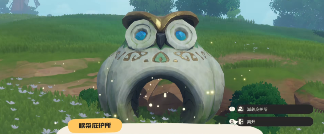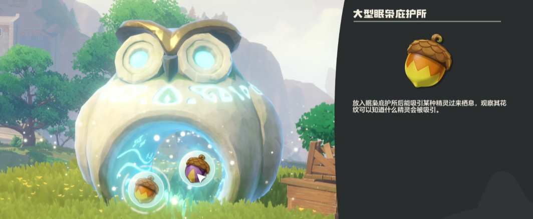 当完成足够数量的收集后,即可在地图上定位并前往各个眠枭庇护所。接近目标建筑后与其交互,选择“滋养”选项进行激活。成功滋养后便可放入对应的精灵果实,该区域随后便会开始刷新对应种类的野生精灵。