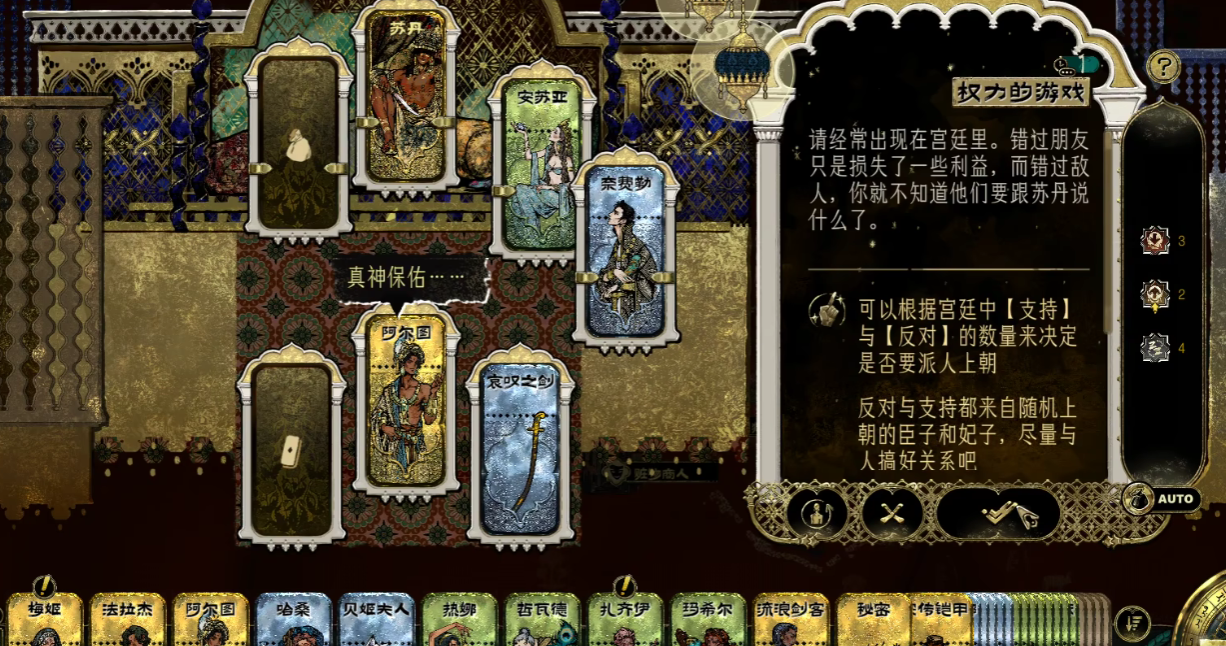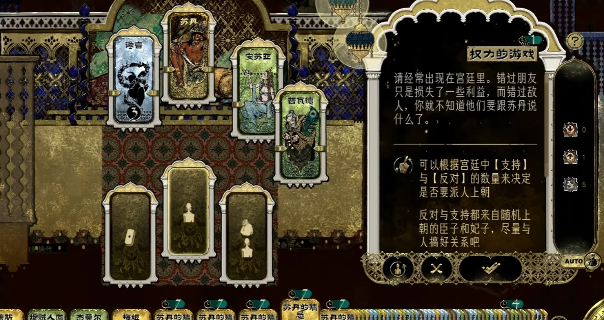 第一种为常规手段,但仅可使用一次。若玩家尚未完成“莎姬任务”,可在权力斗争环节主动触发请罪操作,通过提交苏丹的猜忌卡牌来移除一张负面标记。此行为虽能暂时化解危机,但会带来权势值减少5点的代价,并引发后续持续出现的“苏丹的戏弄”事件。在此类事件中,玩家将被迫做出损害团队利益的决策,影响整体发展节奏。