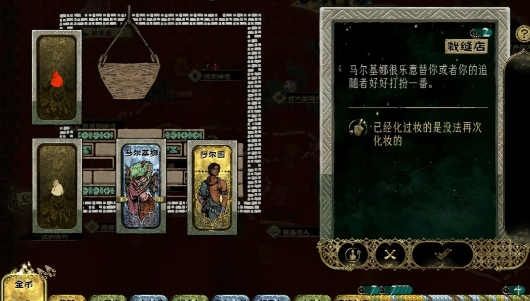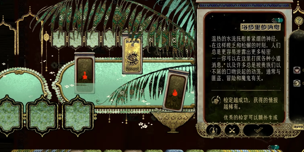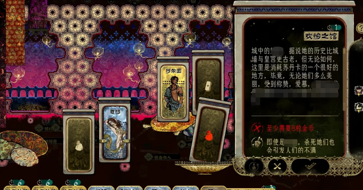 第二种方式发生在欢愉之馆场景中。玩家可通过拒绝女性角色的邀约来直接消除一张猜忌卡。然而,此举会导致不利传闻扩散,同时限制欢愉之馆的部分功能开放。特别需要注意的是,一旦后续获得白银品质或更高级别的纵欲类卡牌,将无法正常处理,可能进一步加剧资源管理压力。