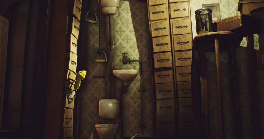 故事始于主角小六在名为“贪颚号”的巨型船只上苏醒。这艘船由多个结构复杂、氛围迥异的区域构成,包括阴冷潮湿的下水道系统、由肥胖厨师统治的厨房区,以及上层甲板中贵妇人所居的奢华却诡异的空间。每一个区域不仅是解谜与逃生的关键场所,也通过其环境设计传递出强烈的叙事信息和心理压迫感。