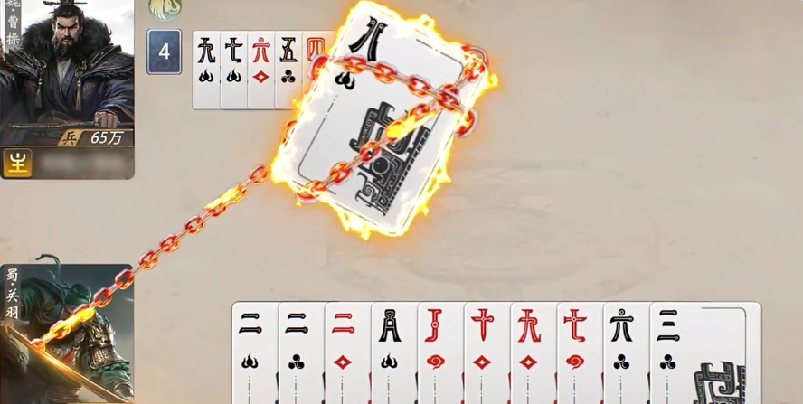 每位武将都具备专属技能,合理把握释放时机能极大影响战局走向。例如关羽在长蛇阵中打出顺子时,可获得一张万能牌,若再配合赤兔马效果,即使缺少一张牌也能完成五连组合;