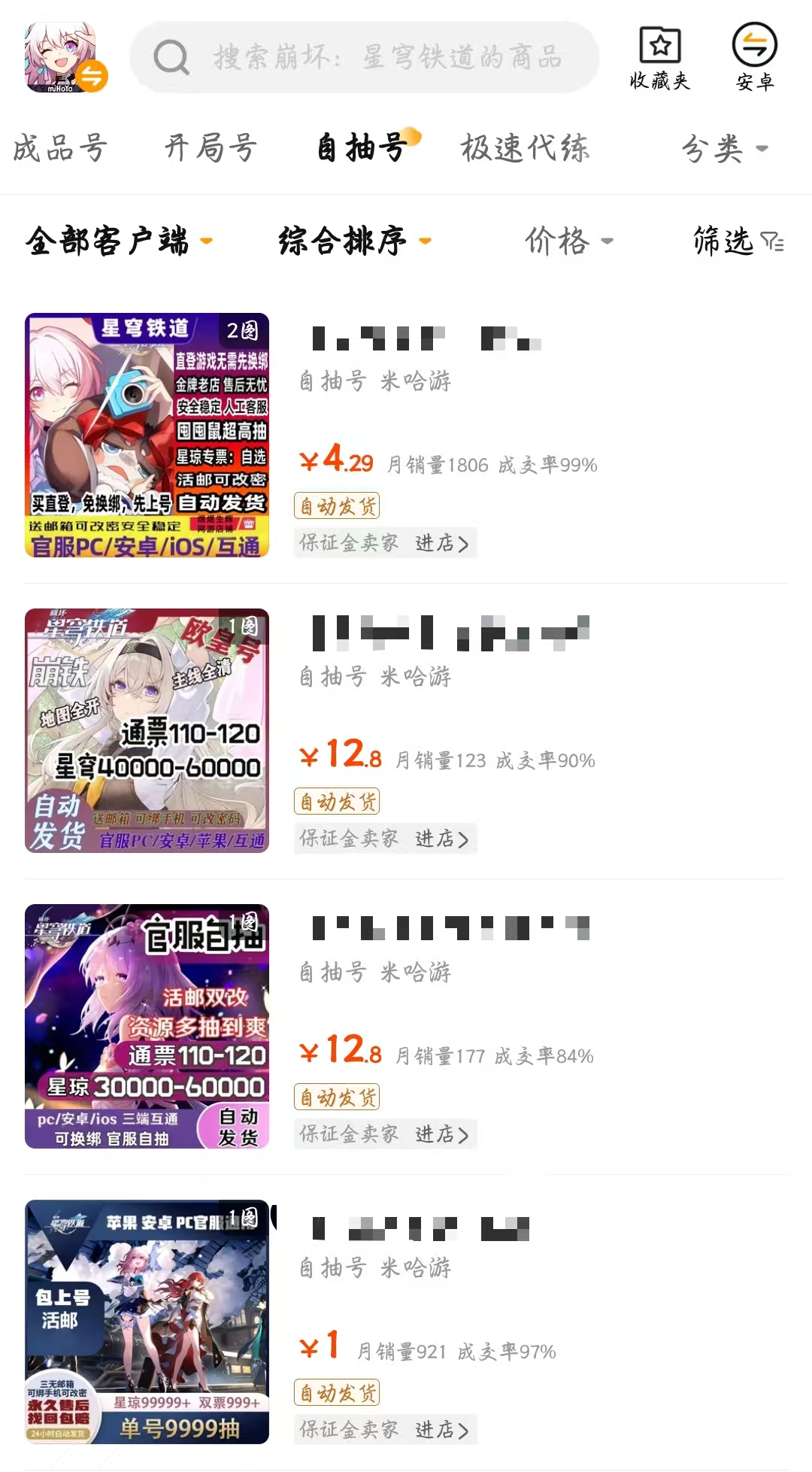 星铁自抽号上哪买?这是当下十分火爆的一款作品,受到很多二次元玩家的喜爱,在游戏中,小伙伴们通常需要通过抽卡的形式获得喜欢的角色,但对于一些才接触这个游戏的玩家来说,慢慢积攒资源无疑是比较困难的,需要耗费大量的时间,如果正巧遇上喜欢的角色,那么只能白白错过,因此大家通常选择直接购买一个自抽号,通常都是拥有超多资源,让大家可以直接抽取。下面就给大家带来一个适合的平台,安全靠谱,且有超多的自抽号和成品号资源。