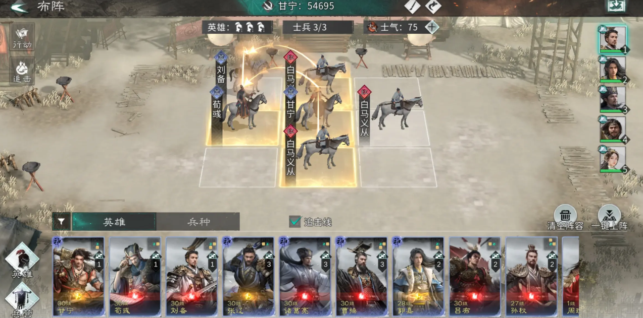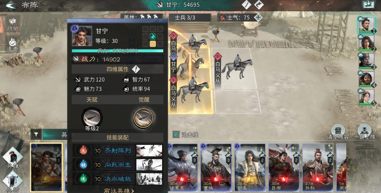 站位方面需根据战场形势灵活调整,优先确保甘宁处于安全输出位置。可将其置于后排,在前排武将吸引火力的同时,为其创造稳定的输出空间,从而最大化技能释放效率。