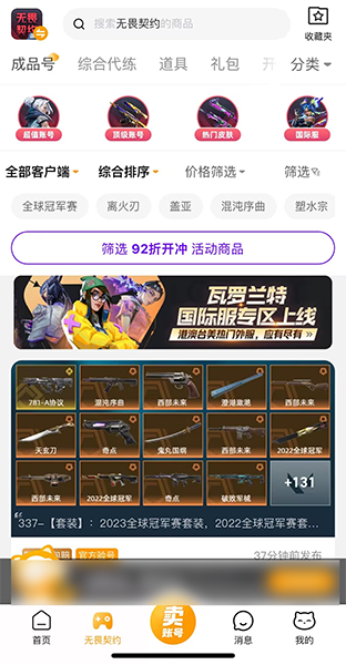 第二,92折扣活动福利限时进行中。进入无畏契约专区之后,玩家点击92折扣福利商品,享受精品账号折扣,挖掘精品高价值皮肤账号,直接拿下稀有的紫皮、橙皮、金皮等资源。