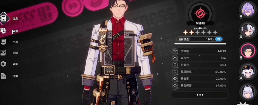 其次是阿德勒,属于咒系防御型辅助。他能够为整个小队提供护盾保护,尤其搭配具有系念属性的弧盘时效果更佳,特别适合配合雨人体系使用。合理配置卡带后,还可进一步强化护盾强度并提升队友攻击力。其E技能可为全队施加基于防御倍率的护盾,而终极技则包含多段打击效果,在输出的同时强化团队防护,适用场景广泛。