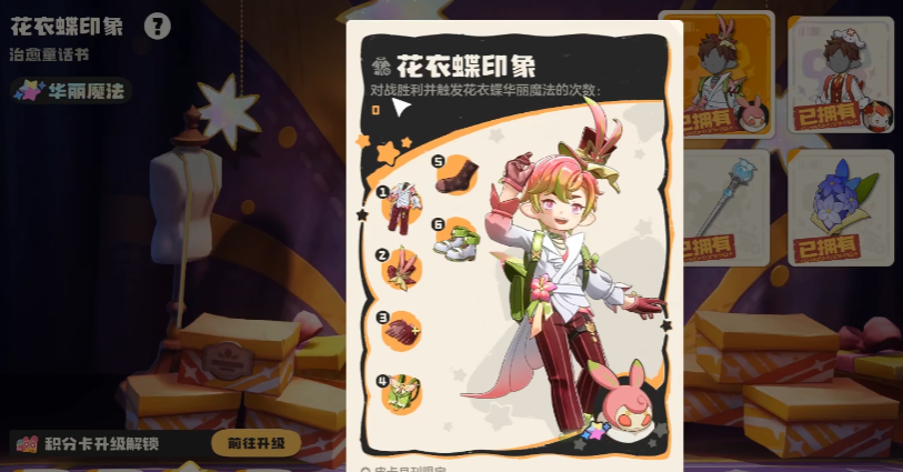 目前最受欢迎的女角色时装为“治愈童话书”系列,包含三套完整装扮:“花衣蝶印象”、“红绒十字印象”和“白金独角兽印象”。此外,该系列还配套推出了三件独立外观道具,分别为“童话书主题法杖”、“挂饰-治愈捧花”以及“治愈童话书”背景装饰。