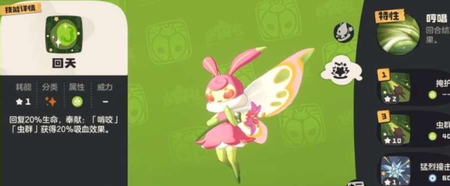 草衣虫拥有一个名为“哼唱”的专属特性,可在每回合结束时有一定概率触发“奉献”效果,有效提升其持续作战能力。作为一只高血量、低攻速的平衡型精灵,草衣虫在队伍中常担任前排角色,能够吸收大量伤害并配合控制技能干扰对手。尽管输出节奏较慢,但其稳定的生存能力和战术价值使其在PVE探索与PVP对抗中均表现出色,是团队中不可或缺的支援力量。