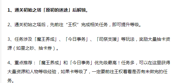 完成主线“原初的迷途”后,系统将解锁王权任务系统,这是中后期稳定获取抽卡资源的核心途径。该系统包含魔王养成、今日事务与司祭支援等多个子模块,不仅能提供丰富的抽卡券,还能同步提升角色等级与战力。其中,魔王养成与今日事务任务数量多、操作简单、奖励丰厚,优先完成可快速积累人物经验与抽卡资源。当主线推进受阻于等级瓶颈时,回头清理王权任务是突破限制的有效手段。除此之外,日常签到、场景互动等轻量级玩法也能持续带来小额资源补充。