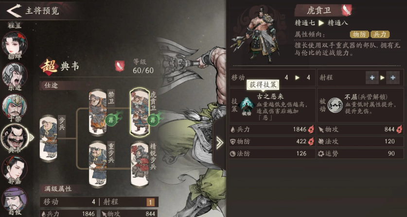 作为步兵系武将,典韦凭借强大的抗伤能力和可观的近战输出,成为前排坦位的理想人选。他不仅能够承担队伍中的伤害吸收职责,还能在战斗中对敌方造成持续压制。其天赋“万夫不当”可提升普通攻击的射程,在反击状态下更能增加35%的追击伤害,显著增强了他在对抗中的输出效率。