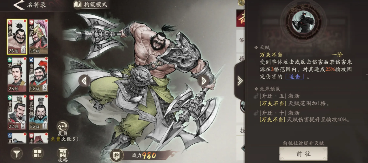先来看典韦,作为一名前排核心输出兼坦克型角色,他的主要优势在于高生存能力和稳定的反击输出。由于拥有极强的承伤属性,典韦能在战斗中有效吸收敌方火力,同时通过反击对攻击者造成可观伤害。在前期阶段推荐优先升级“折冲御敌”技能,不仅能提升自身防御稳定性,还能在对抗高爆发敌人时保持血量健康。对于偏好近战硬刚玩法的玩家来说,典韦是一个非常可靠的选择,即使面对强力BOSS也能维持良好的站场能力。