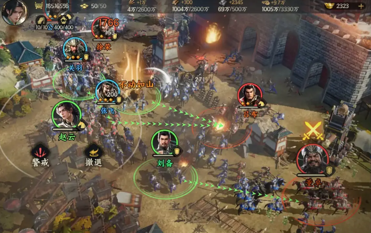 该组合以高频率普攻和追击机制为核心。三位武将均具备出色的单体打击能力,普通攻击有一定概率触发追击效果,实现额外输出。马云禄在激活兵书后可追加一次普攻机会,进一步提升输出节奏;赵云的被动技能可增加骑兵部队的移动速度,增强战场机动性;马超则能依据自身与目标之间的移速差值,提升普攻伤害。此外,马云禄的被动还能强化全队武将的普攻强度,非常适合用于快速清野或小规模遭遇战。