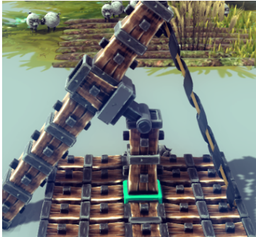 整体高度建议设定为角色身高的1.5倍左右,过高会导致重心不稳,容易发生摇晃;过低则会影响抛射角度,降低打击效率。铰链作为关键转动部件,其安装位置和状态直接影响投石机能正常运作。应将铰链安装在支撑杆顶部,并确保转轴处于水平状态,能够自由旋转。安装时需注意居中对称,使两侧距离相等,防止因受力不均造成倾斜。可选用一根长约两米的木质杆件作为主支撑臂,放置于铰链之上,形成主要杠杆结构。