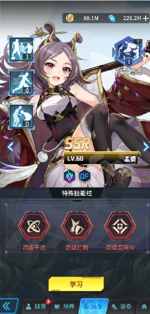 以冷静著称的孟婆擅长在瞬息万变的比赛中捕捉关键节奏,做出精准判断并有效阻断对手攻势。她的主动技“钢铁意志”可确保己方队友在接下来的一轮进攻中免疫被铲球拦截的风险,持续至当前回合结束,每场仅能释放一次,且需处于己方控制状态下才能触发。激活神话装备后,可全面提升传球、拦截与干扰等核心属性。当她与羁绊英雄龙女共同上阵时,技能协同效果更佳,属性加成更加明显。