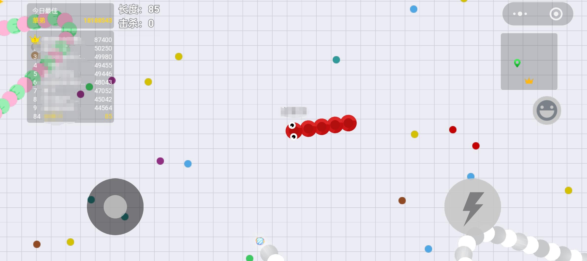 地图上分布着大量彩色圆点,这些是可供吞噬的基础食物。每吃掉一个,蛇的身体就会增长一节。同时,场景中还会出现其他玩家操控的蛇体。若你的蛇头成功撞击对方身体,对方将立即死亡并分裂成多个食物团,你可以迅速吞食以实现快速成长。反之,如果你的蛇头撞上了其他蛇的身体,则自己会被淘汰,并留下大量食物供他人获取。