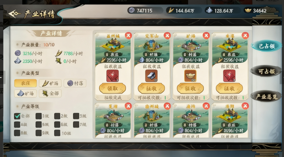 已占有的产业可通过使用特定令符进行征收操作,每个产业每日限征收一次,每位将领每天仅能执行一次农场征收。不同类型的资源点所需令符各异:农庄使用寻访令,村落需征税令,牧场依赖畜牧令,矿场则消耗采矿令。这些令符可通过每日完成战功任务获取,长期积累即可满足日常需求。