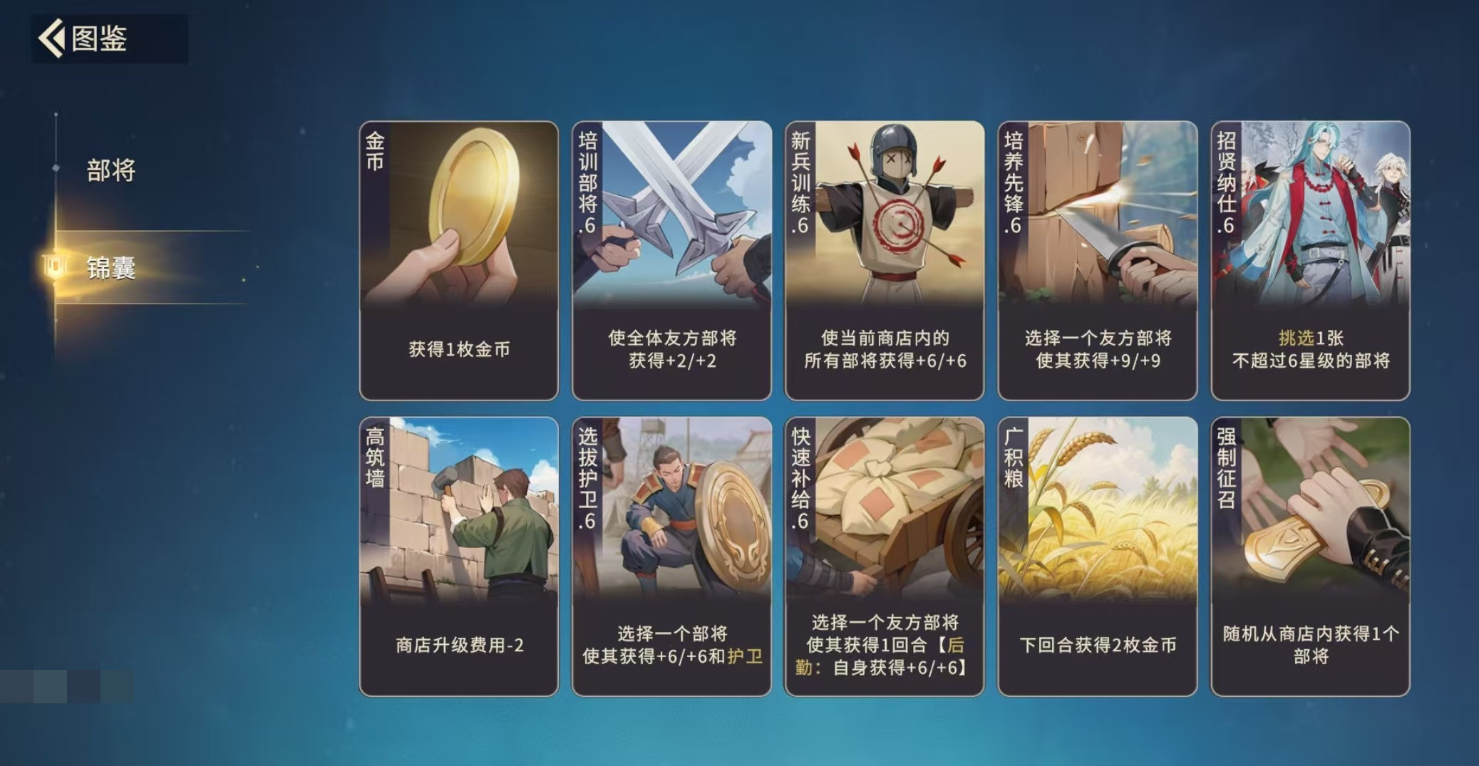 在角色设定方面,游戏融合了历史名将与神话传说元素,每位卡牌角色均具备独立技能与背景故事,同一阵营内的单位可触发专属联动效果,提升战斗表现。为了丰富策略维度,除了常规的经典模式与排位赛之外,还设计了残局推演、国策争霸等多种玩法模式,满足多样化的游戏需求。此外,游戏独创锦囊系统,玩家可在关键时刻使用特殊道具逆转局势,实现逆风翻盘。这一机制显著提升了对局的变数与策略深度。
