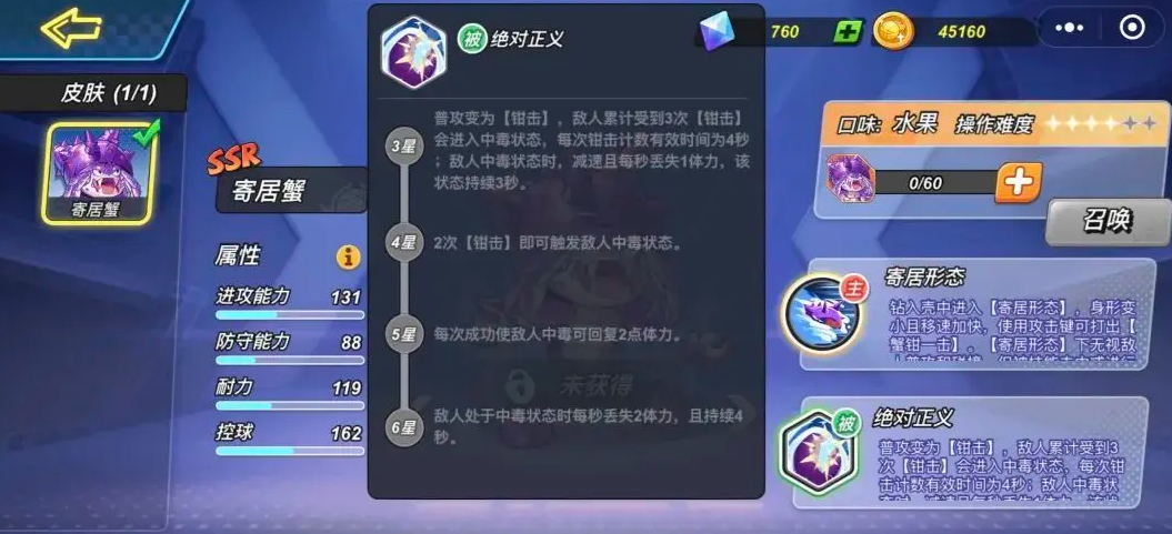 另一个值得关注的机制是寄居蟹的被动能力【绝对正义】。激活后,连续三次普攻可使目标陷入中毒状态,中毒期间敌方移速降低并持续掉血,干扰效果显著。当角色升至四星后,触发条件进一步优化,仅需两次普攻即可施加中毒效果。尽管部分高手玩家凭借高机动性较难被命中,但仍可在对方动作衔接空档期寻找机会,例如在对手完成扣篮落地瞬间进行快速普攻,成功叠加被动后为后续压制创造优势。