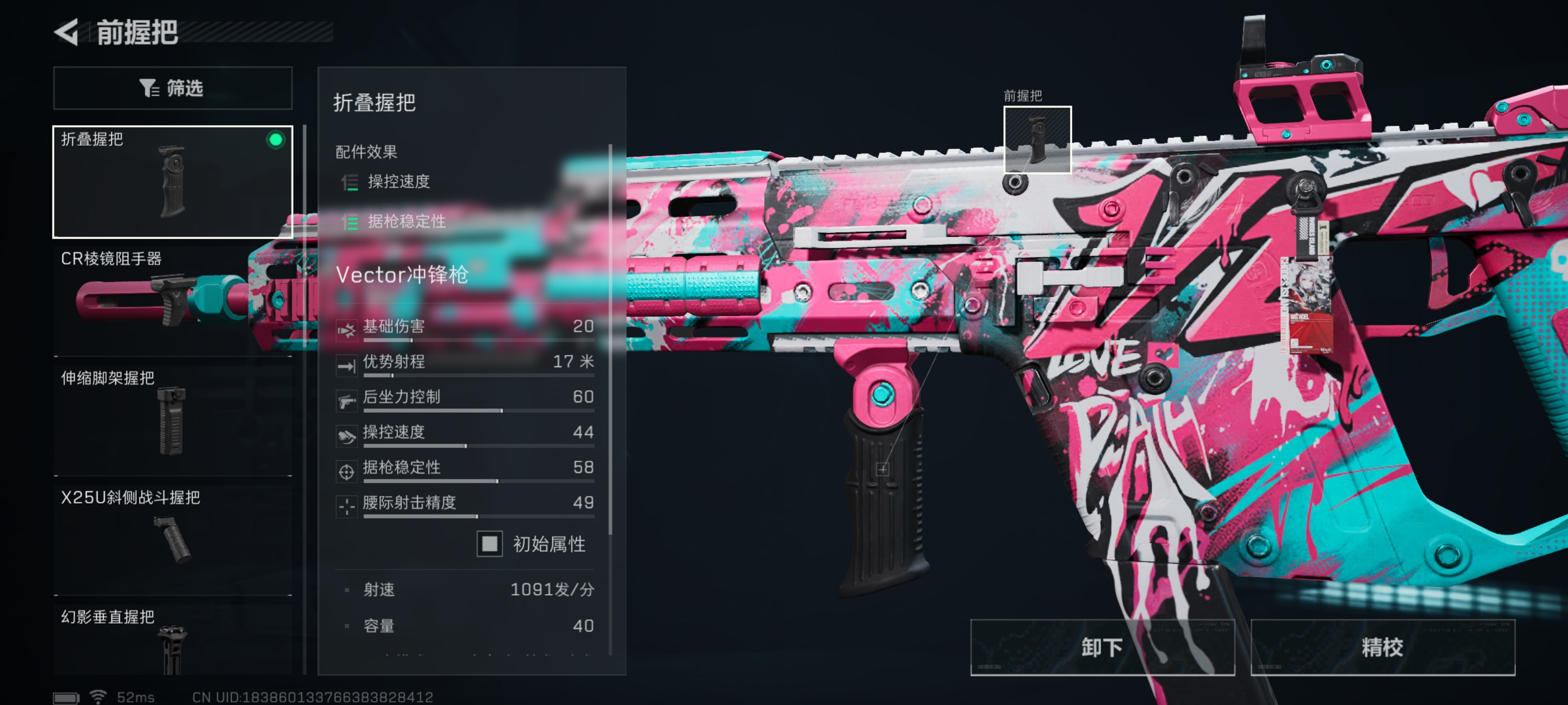 枪管、前握把、枪托全部向右拉满。可以小幅度的提升Vector冲锋枪的稳定性使这把枪更加易上手,下面是靶场测试以及实战测试: