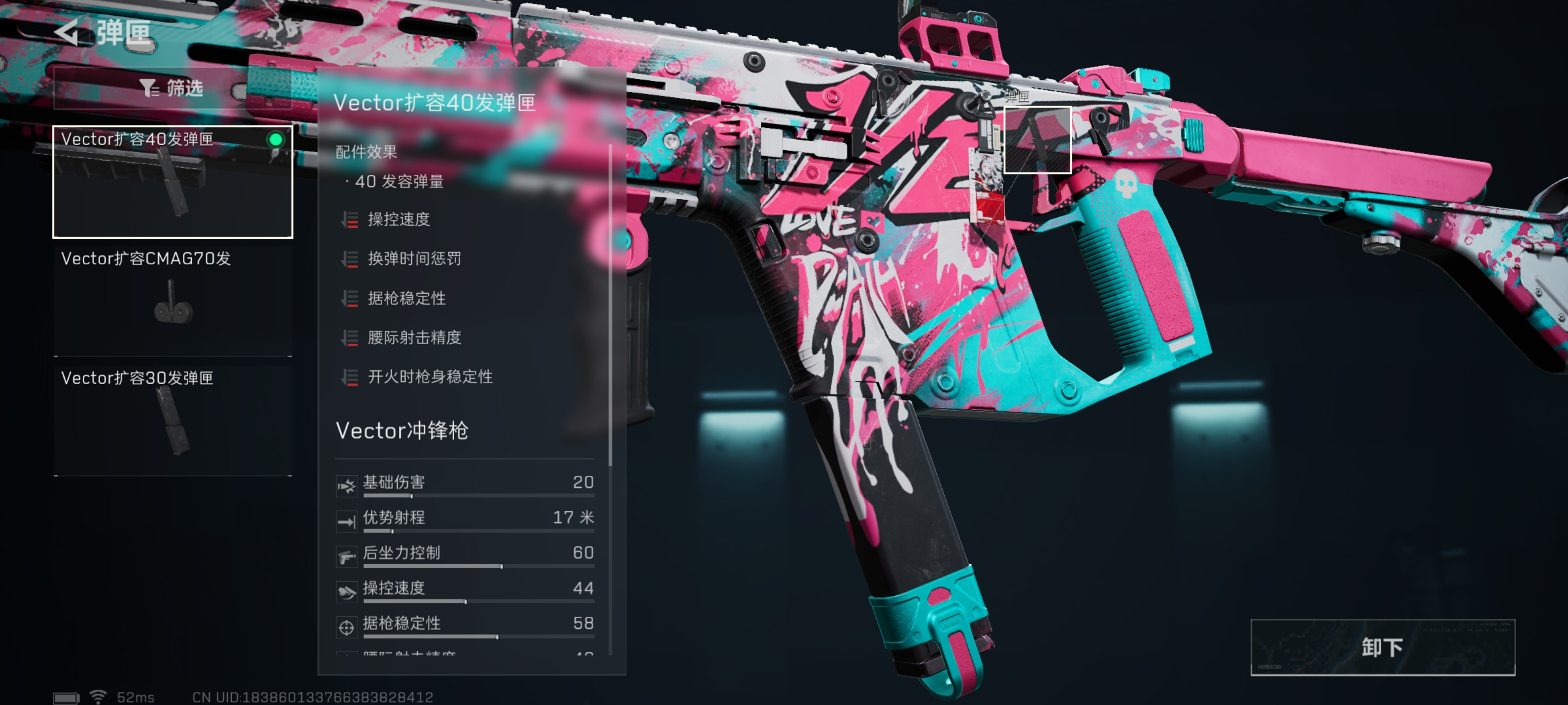 弹匣选择Vector扩容40发弹匣。对比Vector扩容CMAG70发这个配件带来的大额的负面负面属性,以及Vector扩容30发弹匣这个配件的续航能力差,选择这个弹匣带来的负面属性更小是非常合适的。