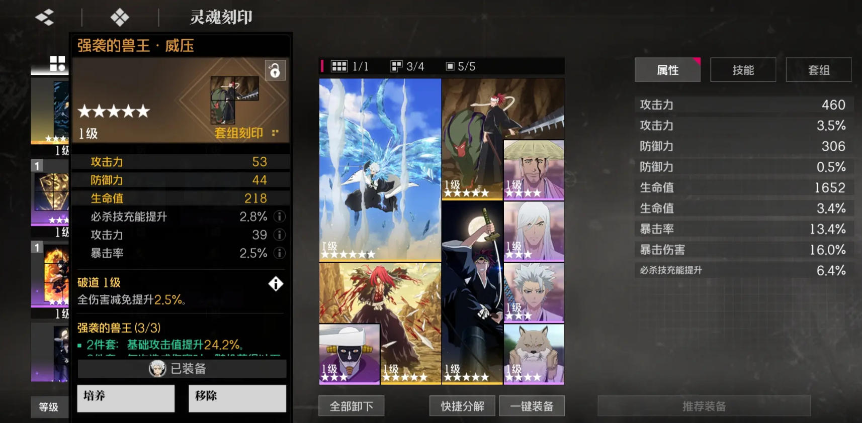 以黑崎一护为例,在游戏前期常因灵压积累机制限制而导致输出疲软,战斗节奏拖沓。装备强袭的兽王后,其基础攻击力显著提高,短时间内爆发能力大幅提升,清怪效率明显改善。而斑目一角这类依赖普攻衔接战技来叠加激扬状态的角色,也能从高额基础攻击加成中受益,每次连击造成的伤害更加可观,连招流畅度和压制力同步增强。