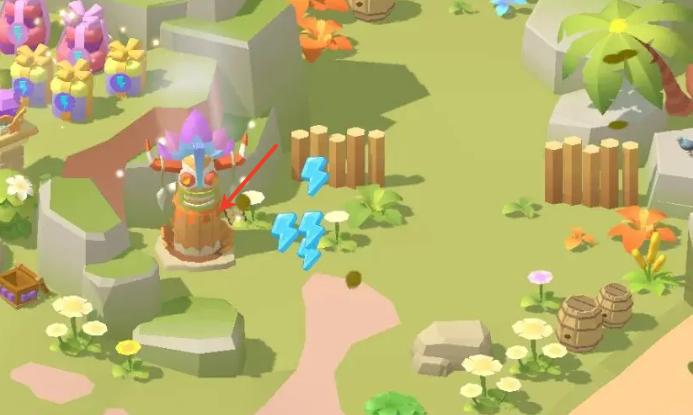接下来是关于土著岛的一些隐藏互动元素。岛上多数静态物件都可点击触发奖励,例如房屋、座椅等建筑,点击后有机会获得金币或恢复体力。位于阶梯附近的木桶同样可以交互,不要遗漏。此外,图腾装饰物散布于场景中,逐一点击也能获取额外体力奖励。各色花丛也是可互动对象,记得顺手点一遍。