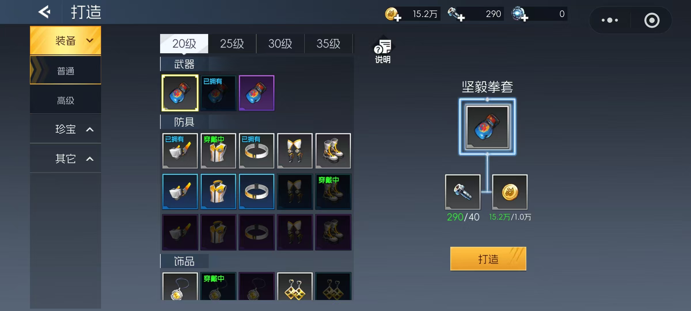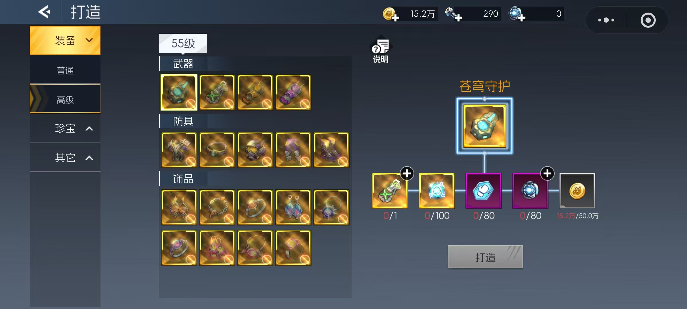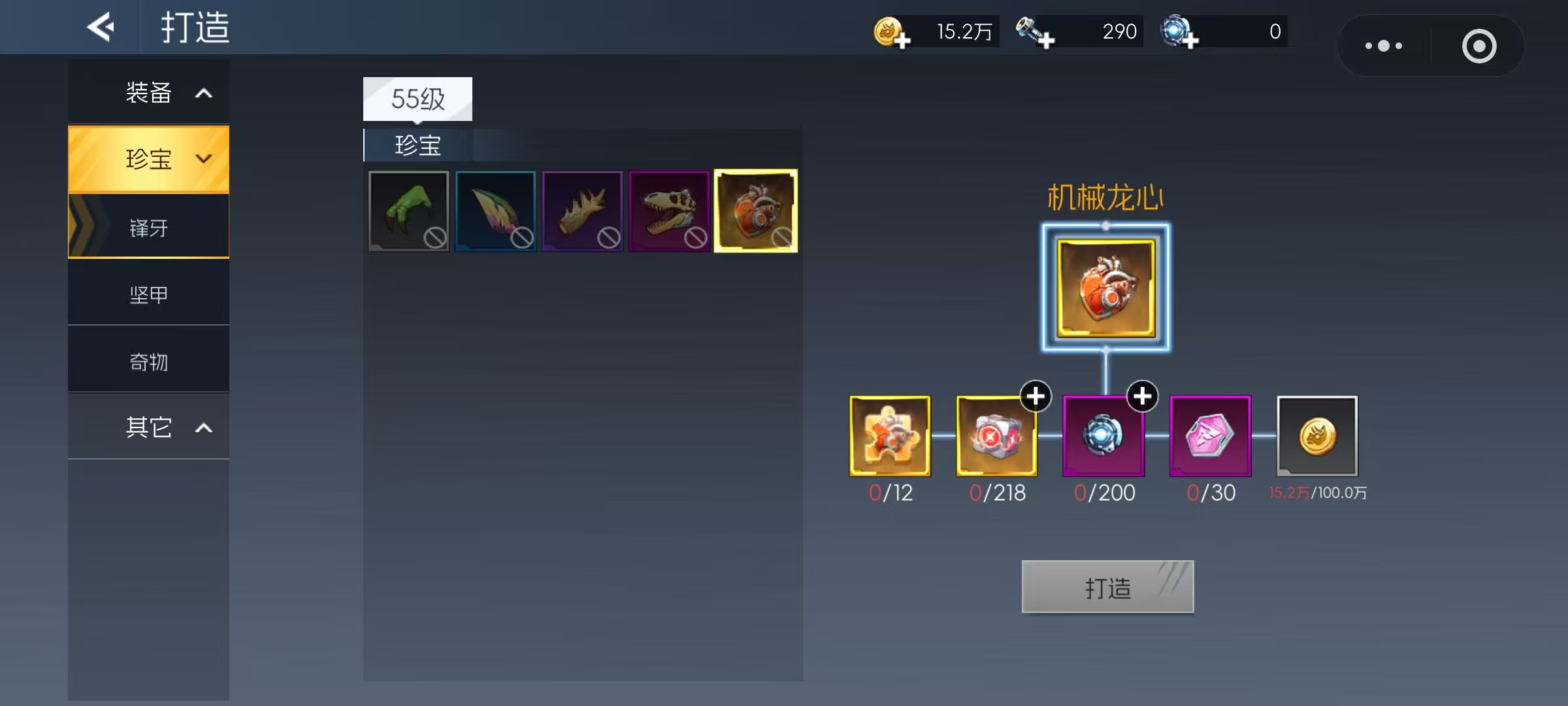 解锁打造功能后,玩家可点击游戏界面右下角的“变强”图标进入相关页面。请注意,打造与改造为两个独立模块,操作时需注意区分。打造主要分为三大类别:装备、珍宝以及其他材料类物品。首先来看装备打造,包含武器、防具和饰品三种类型。普通打造仅需常规材料即可完成,而远古打造则需要稀有资源支持。例如,龙之巢穴掉落的天空之源、始源龙骸,以及遗迹宝库产出的精粹钢,都是进行高级装备打造不可或缺的关键素材。