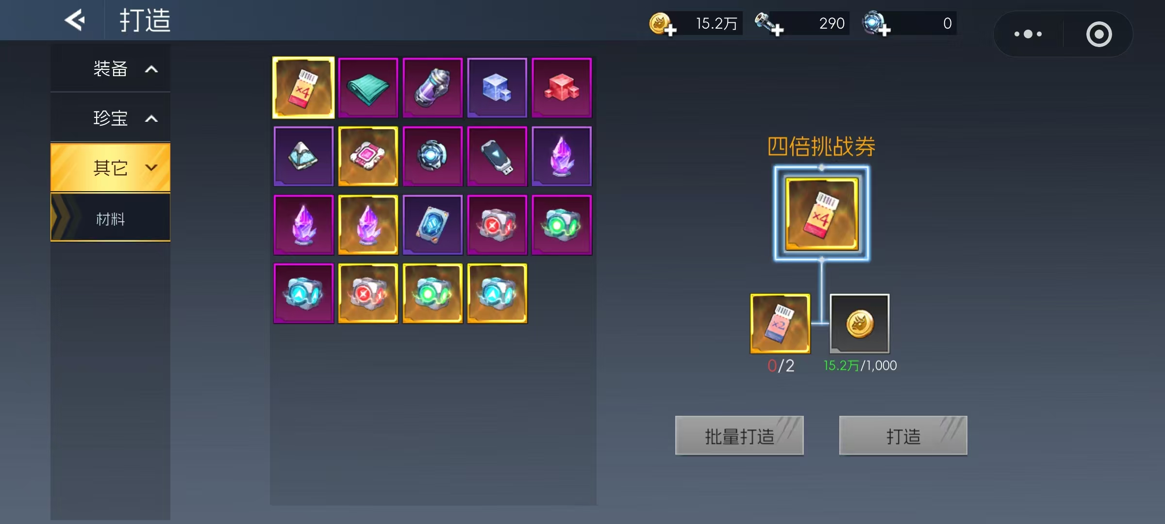 珍宝打造涵盖锋牙、肩甲与奇物三类,每种类型对应不同的战斗增益效果。制作任意一种珍宝均需收集指定材料,这些材料通常来源于“逃生之路”等限时副本活动。成功洗炼出理想特性后,可在挑战高难度BOSS时显著提升输出或生存能力,成为后期战力突破的关键助力。最后一类为其他功能性材料的合成,如四倍挑战券、高级强化纤维、强化保护剂和高级变换物质等。其中,四倍挑战券由两张双倍挑战券加金币合成,高级强化纤维则需消耗普通强化纤维与金币升级获得。这些高阶材料在高端装备打造过程中具有不可替代的作用。