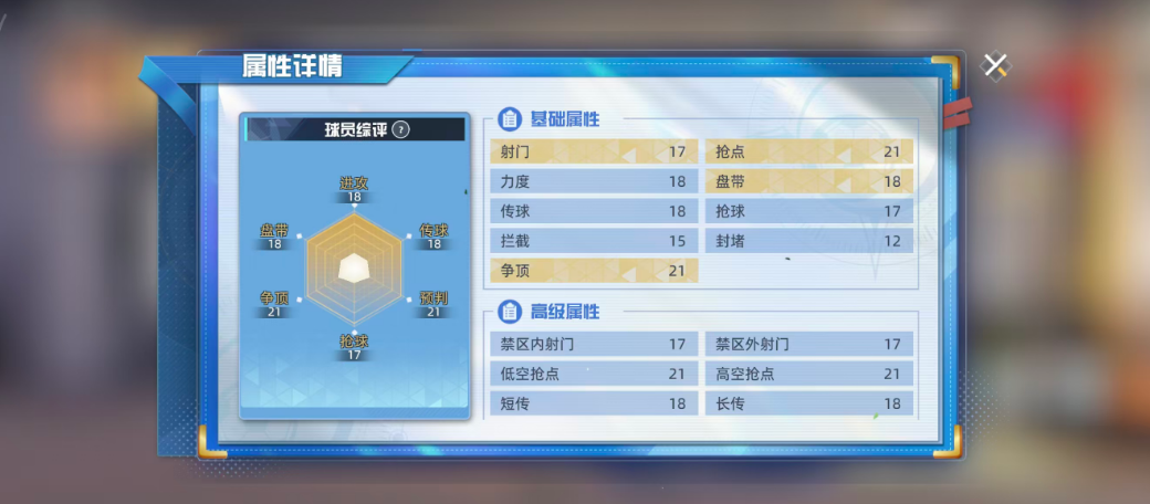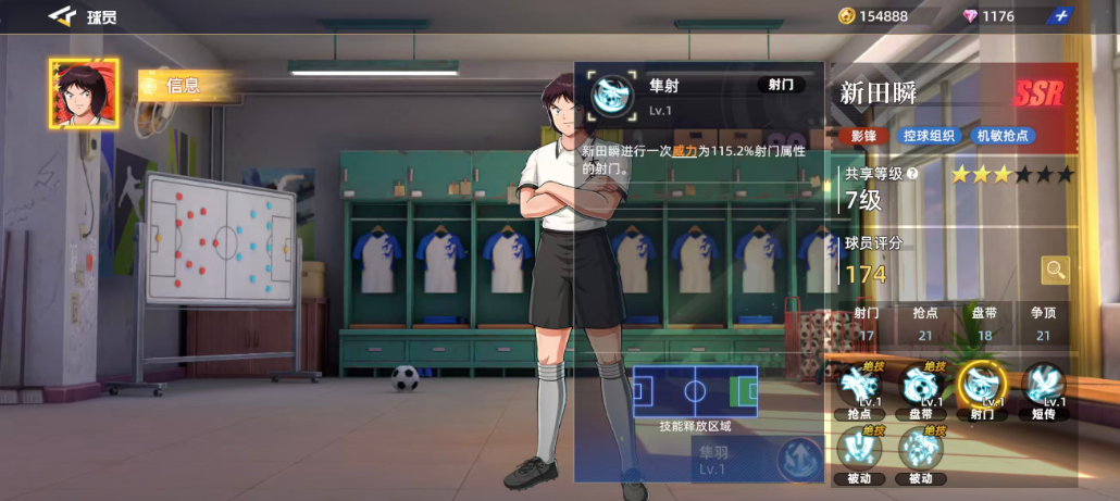 在游戏中,新田瞬被设定为影锋位置的SSR级别球员,这一品质确保了他在同类型角色中拥有较高的使用价值。他不仅可以在前场承担组织衔接的任务,还能凭借出色的抢点意识完成关键进攻动作。基础评分方面,其总分为174,符合当前SSR球员的普遍水平。细分属性中,射门达到17、抢点高达21、盘带为18、争顶同样为21,展现出其在进攻端的多面性。唯一相对薄弱的是抢球能力,在六维图中表现偏低,因此在阵容搭配时应尽量避免让他参与高强度防守对抗。