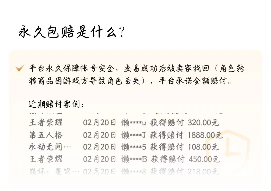 从上方提供的图片当中,大家也能看到,有的账号是标有赠有永久包赔服务,并且由平台发货,所以大家无需担心,在交易的过程中会有卖家从中作梗,一切都有平台为小伙伴们服务,充当中间人,连接交易双方,而且在包赔服务的加持下,后续哪怕大家遇到了售后问题,也可以向平台寻求赔付。