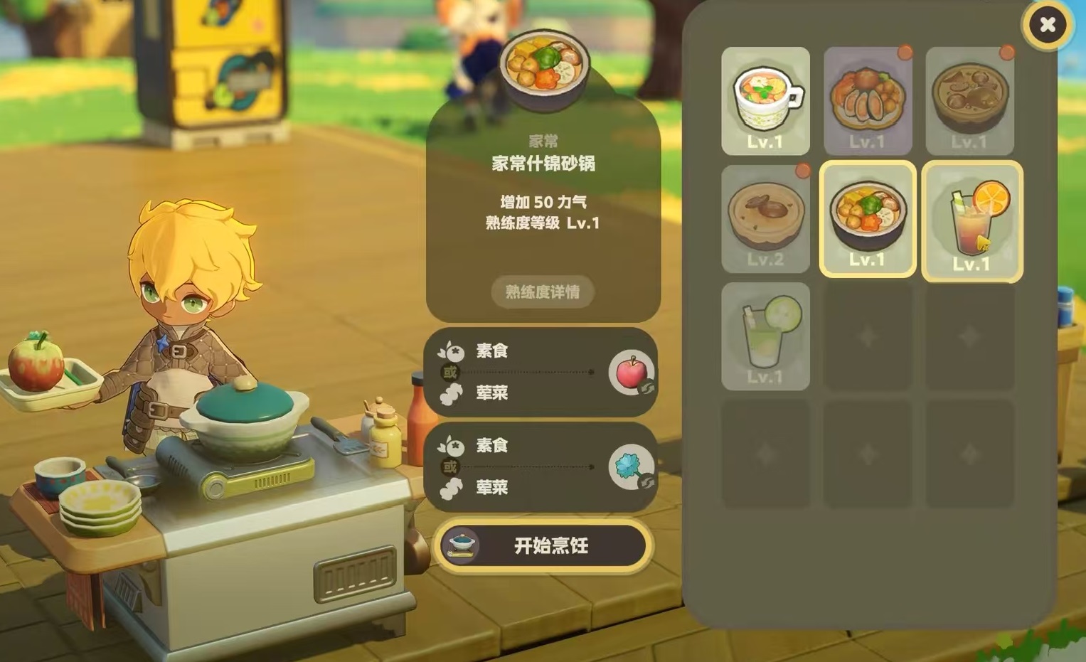 除了主菜之外,游戏中还包含多种饮品类型的料理。和煦花果茶可用两份鲜花或水果调制,消耗50点体力。馥郁果瓜茶需两份水果,制作消耗50点体力。鱼汤由两份鱼类材料组成,耗能50点。绵绵麦奶需两份小麦,同样消耗50点体力。禾夏麦香曲结合小麦与稻米,需50点体力完成。禾夏米酿则由两份稻米制成,消耗50点体力。最后,甜甜米果酿需要一份水果和一份稻米,总消耗50点体力。