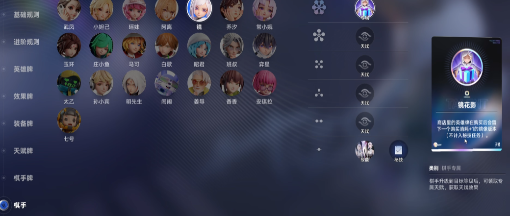 该棋手具备三项核心能力:被动技、秘技与六星专属天赋。战斗初始阶段,其自带3点能量优势,并在每次拍卖环节结束后额外获取3能量,形成前期资源积累优势。其秘技需消耗45能量,发动后可抽取一张名为“为我所用”的特殊卡牌,随机复制本局对战中其他棋手的一张秘技,实现技能借用,在战术搭配上极具灵活性。当升至6星时,将从三位不同棋手的秘技卡中任选其一继承,进一步强化策略多样性。