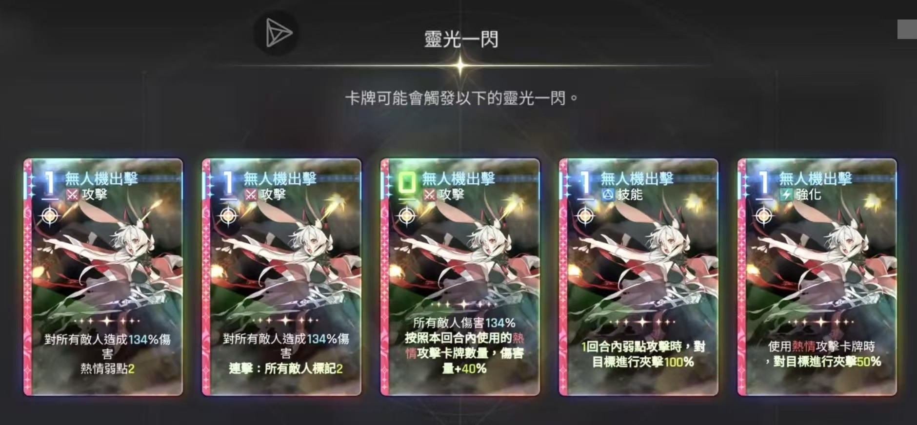 从基础技能来看,席琳娜拥有一张费用仅为1点的交战射击卡牌,可稳定打出100%伤害,配合另一张1费紧急遮蔽技能,能够为自己或队友提供等额护盾,有效提升生存能力。在专属技能方面,捕捉目标可在造成100%伤害的同时施加一层标记;高倍瞄准镜则能叠加两层标记,适应多种战斗场景。当敌人被标记后,后续攻击将触发额外伤害效果。此外,无人机出击可对全体敌人造成范围伤害,并附加热情弱点状态,显著增强队伍中热情属性角色的输出效率。