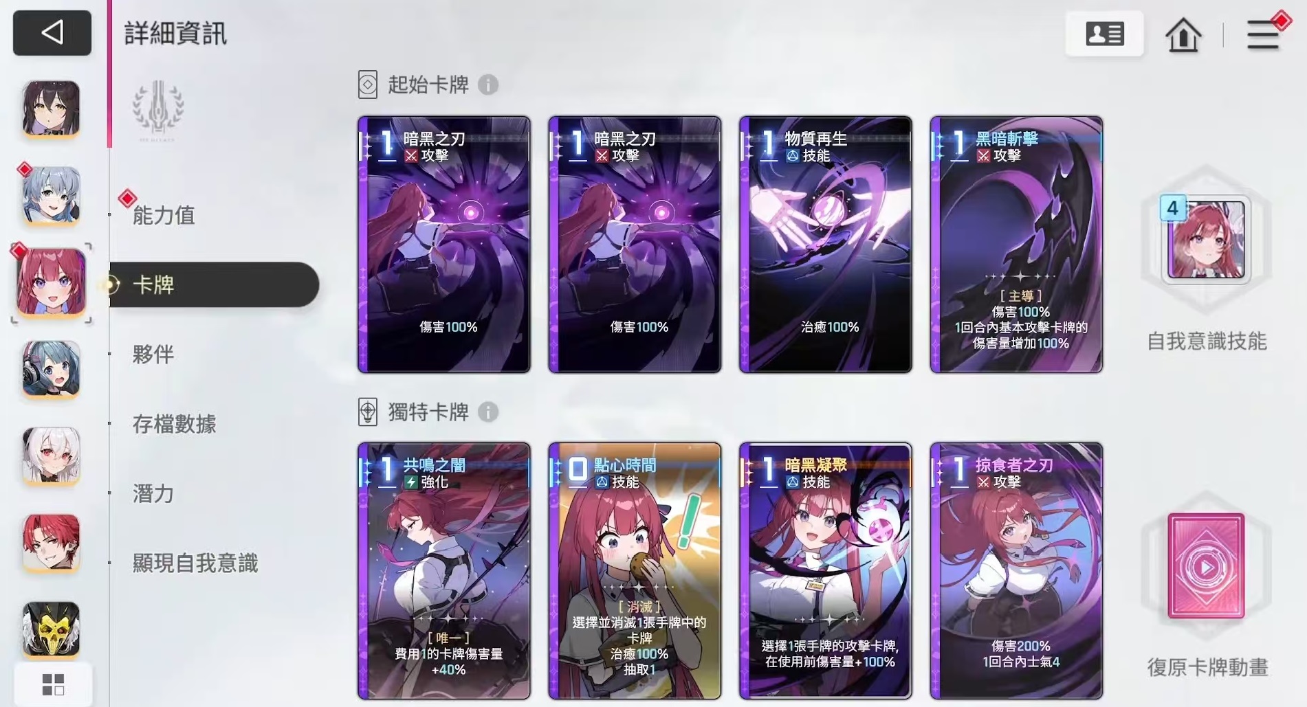 蕾伊初始携带两张一费攻击卡和一张一费技能卡。攻击卡“暗黑之刃”可造成106%的基础伤害,具备稳定的前期压制力;技能卡“物质再生”则根据防御属性提供治疗,回复效果还与队伍成员当前的压力值挂钩,提升了生存灵活性。在特殊卡牌方面,她拥有多张功能性极强的手牌。