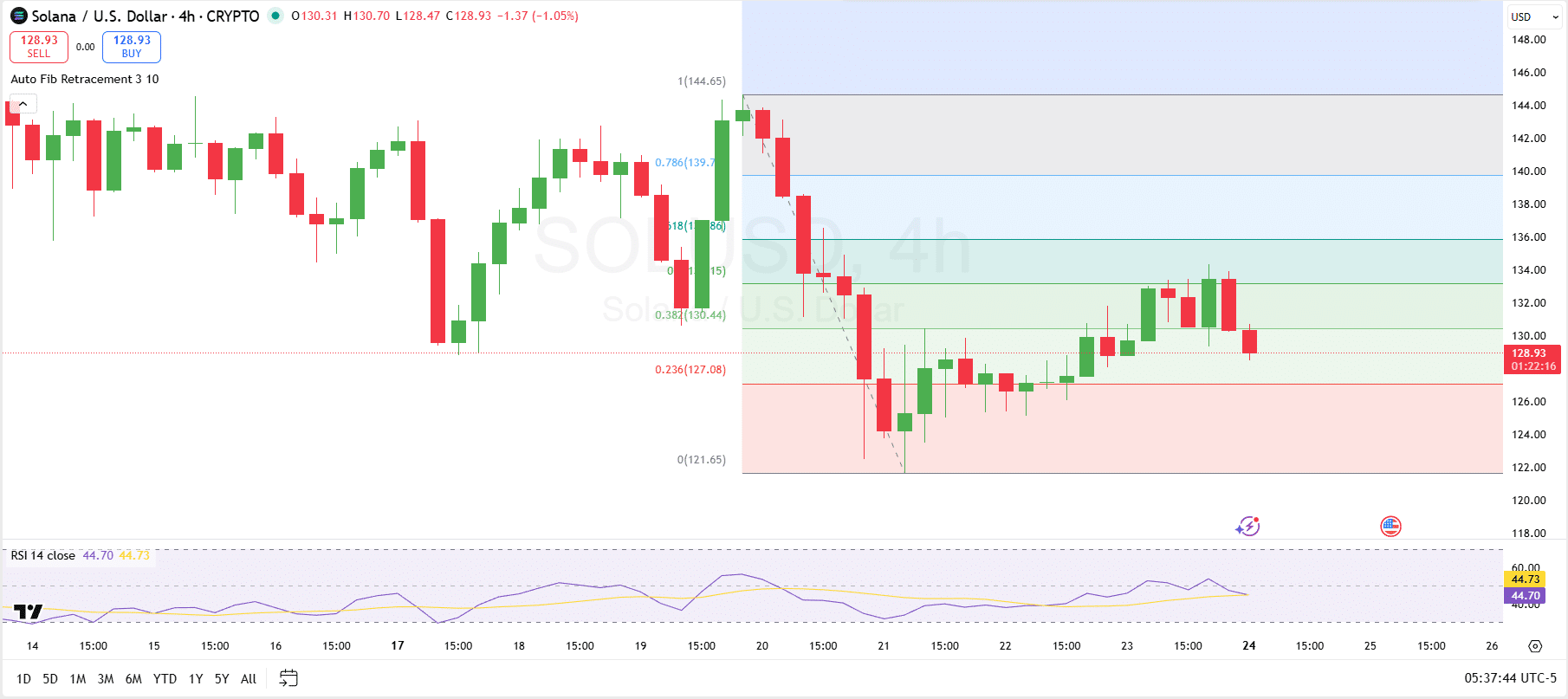 在TradingView的4小时图上,斐波那契回撤工具显示SOL从144.65美元至121.65美元的近期跌势。价格虽从低点反弹,但在未能站稳130.44美元(0.382回撤位)和133.15美元(0.5回撤位)后再度回落。